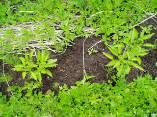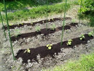 2008年5月21日、植えつけてしばらく経ったトマト、ししとう、かぼちゃ、ナス、トウモロコシなどの夏野菜に京堆肥をマルチングしました今回は1cm厚さと5cm厚さにしました。